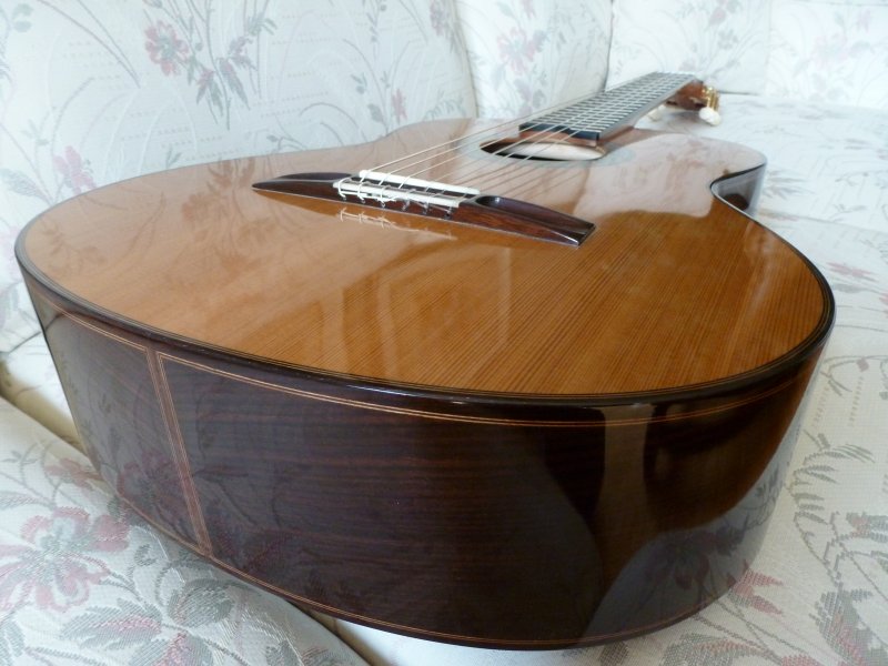 I also found that the weight of the bridge is more easily controlled. The objective I was looking to achieve was an improvement in treble response and balance so that crescendos could be more easily achieved in melodic passages, particularly those involving treble string notes going above the 12th fret. The results from guitars utilizing the design have been very gratifying to the extent that several of my clients have asked me to retrofit the design to their guitars. |