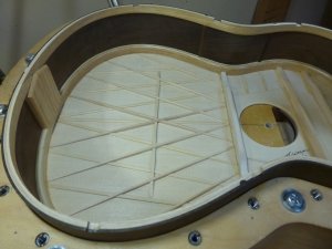 innovations to the satisfaction of myself, my group of evaluators and my clients by building at least 6 instruments before going on to address the next challenge. The latest innovation was introduced in 2012 with the reconfiguration of the top bracing design I've been using and the results truly represent the culmination of my efforts over the past 30 years. Descriptions of the more important elements of my guitar design/features and the performance issues that they each address are set out below. |