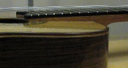 In 2003 I modified my design to so as to incorporate an elevated fret board. This was achieved by rotating the top using the bridge saddle as the point of a fulcrum so that, in fact, the fret board is not really elevated but rather the top is simply sloped downward. In order to maintain the plane of the bridge, the top is fully domed with the apex of the dome located at the mid point of the entire top in front of the bridge. This results in a very uniform top shape as opposed to deformation that occurs when only the lower bout is domed. In order to achieve the Spanish heel architecture the recess in the neck for insertion of the sides must stop at the proper distance below the fret board. In addition the top now had to be inserted into the neck and glued to the underside. The top photo details the kind of work necessary. The benefits I was looking for from the elevated fret board were as follows: |